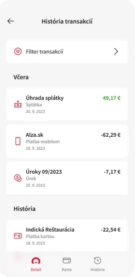 V histórii transakcií vidíte prehľadne všetky svoje nákupy, prevody aj splátky.
