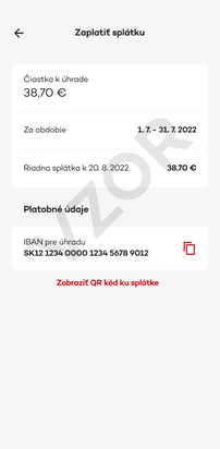 Pri vybavovaní úveru ste si zvolili výšku mesačnej splátky, ktorá vyhovuje vašim možnostiam a potrebám. Túto sumu tiež uvidíte vo vašom výpise.