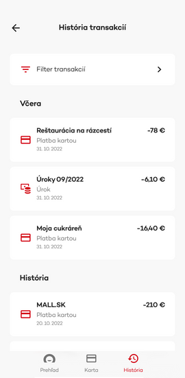 V histórii transakcií vidíte prehľadne všetky svoje nákupy, prevody aj splátky.