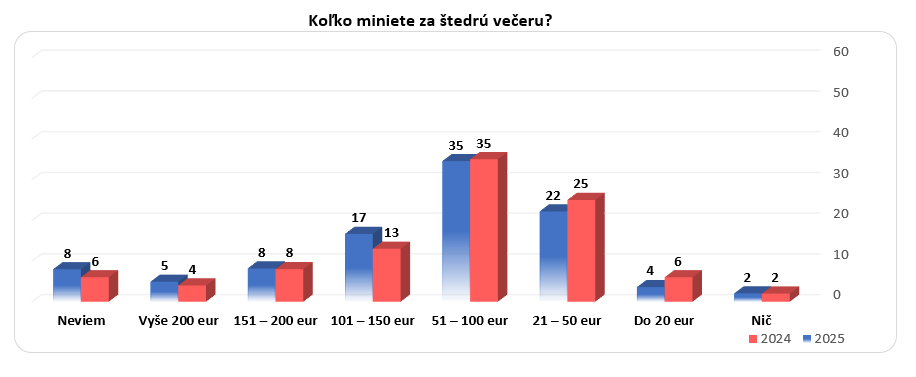 Blížiace sa sviatky sa spájajú vo väčšine rodín na Slovensku aj s neodmysliteľnou niekoľkochodovou štedrou večerou a rôznymi dobrotami na vianočnom stole, ktoré spolu ukrajujú nemalé sumy z domácich rozpočtov. Podľa prieskumu pre spoločnosť Home Credit, najviac domácností, a to 35 percent, vyjde kompletná štedrá večera od 50 do 100 eur. Ďalších 22 percent na to vynaloží 20 až 50 eur. Štyri zo sto rodín sa budú musieť poriadne uskromniť s výdavkami pod 20 eur. Naopak, 17 percent opýtaných si môže dovoliť minúť 100 až 150 eur a 5 percent prekročí aj 200-eurovú hranicu. „Dáta z prieskumu nám ukázali, že tie nižšie sumy za štedrú večeru sa častejšie týkajú ľudí zo Žilinského kraja. Na druhej strane, vyššie položky, a to 150 až 200 eur zase vo vyššej miere spomínajú respondenti z viac ako 5-členných rodín, čo je, samozrejme, logické vzhľadom na potrebné väčšie množstvo surovín. No a náklady na štedrú večeru presahujúce 200 eur častejšie v prieskume deklarovali opýtaní s mesačným príjmom domácností 3 až 4-tisíc eur,“ komentuje analytik Home Creditu Jaroslav Ondrušek. Plánované sumy vynaložené na tohtoročnú štedrú večeru sú vo všeobecnosti podobné ako vlani. „No napríklad, kým pred rokom zaplatilo 100 až 150 eur 13 percent opýtaných, teraz je ich v tejto skupine o 4 percentá viac,“ dodáva analytik.