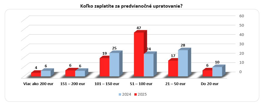 Vo väčšine rodín si s tým poradia sami, no je tu 8 percent takých, čo zvyknú veľké predvianočné upratovanie zveriť nejakej firme či upratovačke. „Podľa vyjadrení ľudia za kompletné vyupratovanie bytu či domu najčastejšie zaplatia od 50 do 100 eur. Je ich až 47 percent, no minulý rok ich bolo v tejto cenovej hladine o polovice menej, len 24 percent. Dvaja z desiatich zaplatia 100 až 150 eur a jeden z desiatich aj vyše 200 eur,“ približuje Jaroslav Ondrušek.